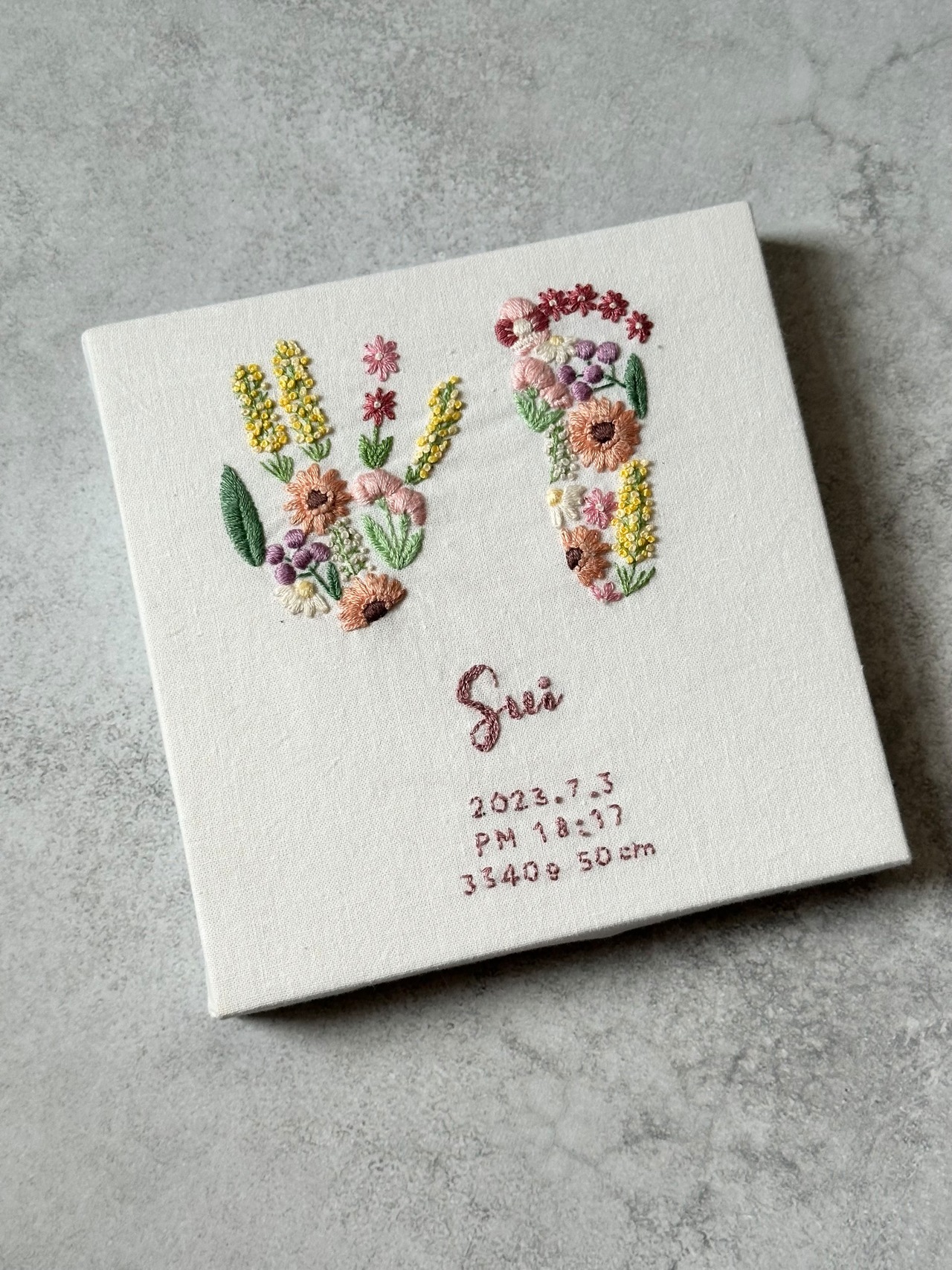 手足型刺繍ボード《春のお花畑デザイン》15×15サイズ 命名書 出産祝い